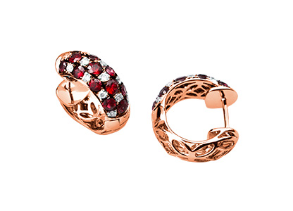 Absolutely stunning, these beautiful 18ct rose gold diamond and ruby huggie hoop earrings are intricately crafted. The breath-taking checker pattern of diamonds and beautiful red rubies, complement each other to the point of perfection. Sure to be the crowning glory of any ensemble.