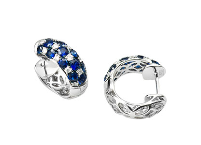 Absolutely stunning, these beautiful 18ct white gold diamond and sapphire huggie hoop earrings are intricately crafted. The breath-taking checker pattern of diamonds and beautiful blue sapphires, complement each other to the point of perfection. Sure to be the crowning glory of any ensemble.