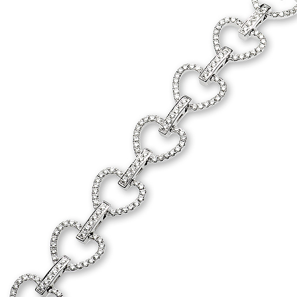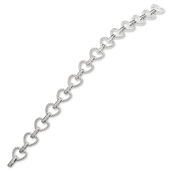 This stunning 18ct white gold bracelet has fourteen claw set diamond hearts brought together with a single pave set diamond bar between each. This bracelet has a concealed clasp for a continuous uninterrupted flow of diamond hearts and bars.