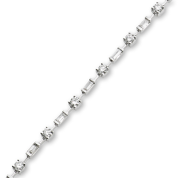 This pretty and elegant 18ct white gold bracelet has nineteen round claw set diamonds, brought together with a single baguette diamond between each, with a moving joint next to every stone to allow the bracelet to hug the ladies wrist. This feature creates a very feminine style.