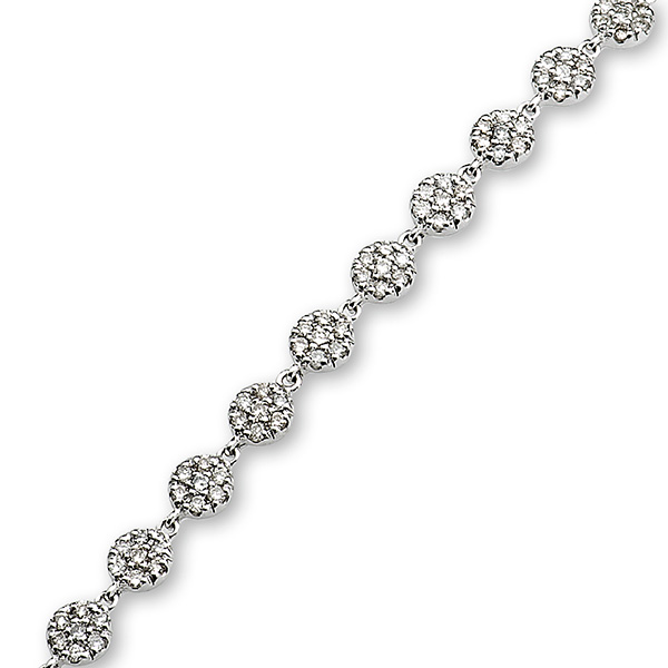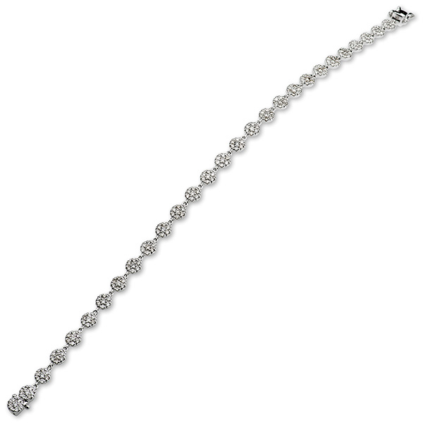 This piece is made up of twenty-eight round cluster sections, set with seven round brilliant cut diamonds in each cluster then joined together with two small rings between each section, this allows a continuous smooth, elegant movement. Fitted with a concealed box clasp and two figure of eight safety clasps.