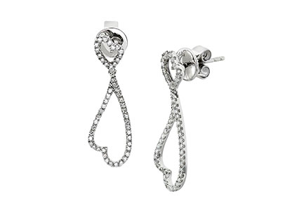 These exquisite drop earrings with touching hearts, are claw set with one hundred round brilliant cut diamonds,