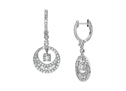 Simply stunning, these beautiful 18ct white gold diamond drop earrings are set with one hundred and six round brilliant cut diamonds. Intricately crafted, a round brilliant cut centre diamond in a separate setting is surrounded with a glittering round crescent design hung from a diamond encrusted loop ear fitting. Made of three separate moving parts which will create a dazzling display of sparkle and fire as you move.