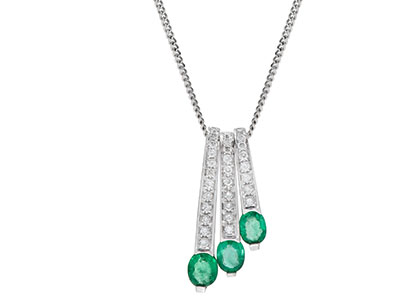 This pendant is created into three separate 18ct white gold graduating bars, encrusted with diamonds and accentuated with three oval emeralds. This breath-taking design has an unusual elegance that will turn heads with admiring glances. We are sure this pendant will become a long term favourite to your collection.