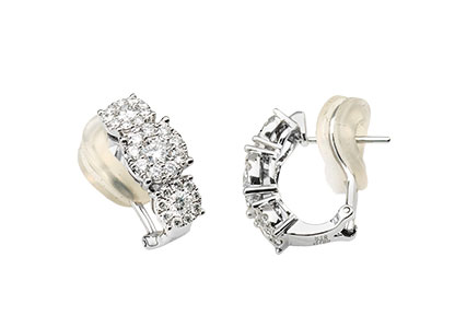 Simply stunning, these beautiful 18ct white gold diamond huggie stud earrings are elegant and intricately crafted. These “trilogy” three round shaped white gold cluster settings have a larger cluster in the centre than the sides and are encrusted with sparkling, round white brilliant cut diamonds which will create a dazzling display of sparkling fire as you move. They have an omega style fitting on the back which is inserted with a soft plastic cushion for extra comfort.