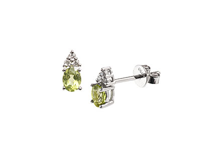 Simply stunning, these beautiful 18ct white gold stud earrings are elegant and intricately crafted. Claw set with a cool apple/olive green oval peridot and three round white sparkling brilliant cut diamonds set at the top in the shape of a triangle, which creates a dazzling display of sparkling passion.