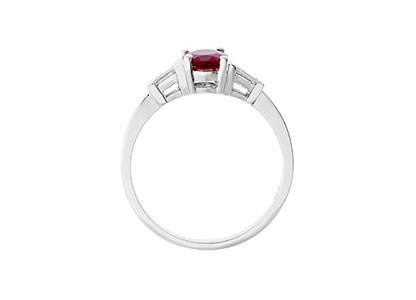 This gorgeous 18ct white gold ruby and diamond ring has an elegance that makes it exceptional, with one oval brilliant cut ruby centrally set and raised slightly higher than the two baguette cut diamonds, which are set on each side. This unusual ring inspires adoration from young and old alike.
