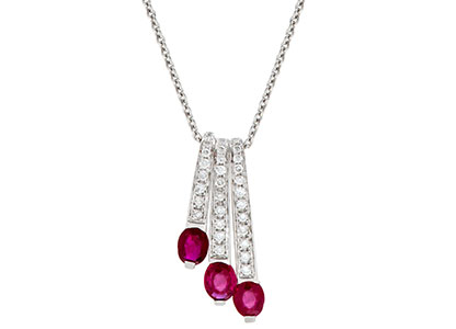 This pendant is created into three separate 18ct white gold graduating bars, encrusted with diamonds and accentuated with three oval rubies. This breath-taking design has an unusual elegance that will turn heads with admiring glances. We are sure this pendant will become a long term favourite to your collection.