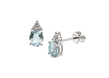 Simply stunning, these beautiful 18ct white gold stud earrings are elegant and intricately crafted. Claw set with a pale blue oval aquamarine and three round sparkling brilliant cut diamonds set at the top in the shape of a triangle, which creates a dazzling display of sparkling passion.