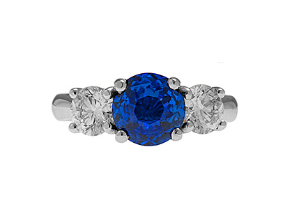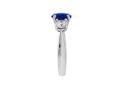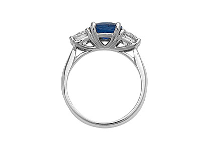 This stunning 18ct white gold sapphire and diamond three stone ring, is set to the centre with a gorgeous round brilliant cut sapphire weighing 1.77 carats and is probably the most rare and sort after shade of royal blue sapphire available. Â Complimented with a sparkling bright white diamond to each side, makes this elegant ring truly exceptional.