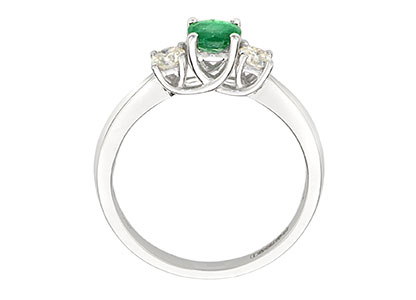 This beautiful 18ct white gold emerald and diamond three stone ring, has an elegance that makes it exceptional, with one round brilliant cut emerald centrally set and raised slightly higher than the round brilliant cut diamonds, which are set on each side. This beautiful ring inspires adoration from young and old alike. A classic ring with a contemporary twist to the setting, as seen from the side view claws overlapping to form a kiss in the centre.