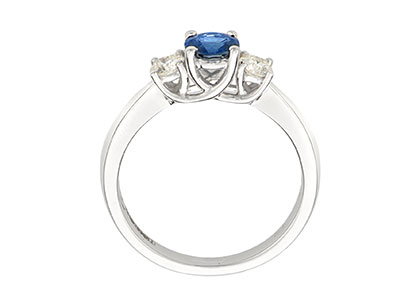 This beautiful, 18ct white gold sapphire and diamond three stone ring, has an elegance that makes it exceptional, with one round brilliant cut sapphire centrally set and raised slightly higher than the round brilliant cut diamonds, which are set on each side. This beautiful ring inspires adoration from young and old alike, a classic ring with a contemporary twist to the setting, as seen from the side view claws overlapping to form a kiss in the centre.