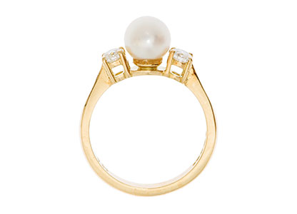 A sophisticated and elegant design with a timeless appeal. This 18ct yellow gold ring has a beautiful single snowy white pearl centre, accentuated with a sparkling white round brilliant cut diamond to each side, giving a perfect contrast of textures with white silky pearl and sparkling white diamonds.
