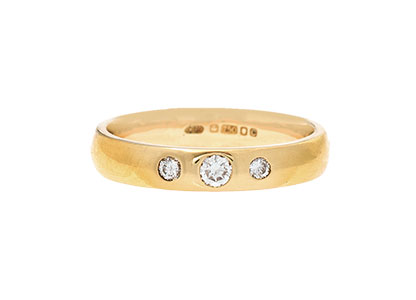 A 4mm comfort fit band, also known as a court shape, which means it is domed on both inside and outside to give a smooth comfortable fit with no sharp edges, invisibly set with three round brilliant cut diamonds. A masculine ring with a touch of elegance.