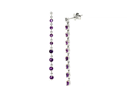 The personification of elegant style and sophistication. These longer than average 9ct white gold drop earrings are 52mm long, starting with a petite round sparkling white diamond to the ear lobe and following on with eight beautiful round graduating purple amethyst.