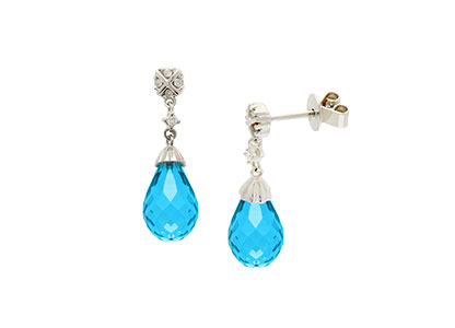 The top stud to the ear lobe has a kiss set with four round white diamonds, the centre section has a single petite round white diamond in a four claw setting, following on to the beautiful teardrop multi faceted sky blue topaz.