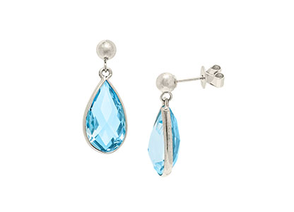 These beautiful sky blue teardrop topaz are multi facetted on both sides and surrounded with a channelled strip of 9ct white gold, suspended from a 4mm white gold ball ear fitting.