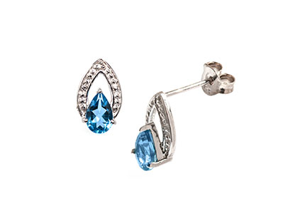 These beautiful 9ct white gold diamond and blue topaz stud earrings are elegant and intricately crafted. The pear shaped blue topaz is crowned with another white gold pear shaped top and set with a single illusion set diamond. Perfect for every day wear.
