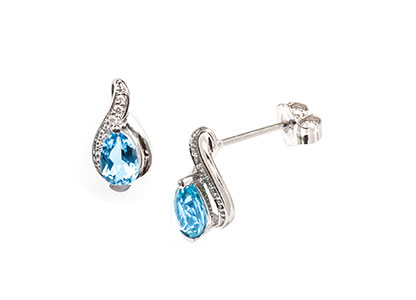 A beautiful cool blue topaz wrapped in a white gold tear drop swirl, set with three sparkling diamonds to one side of each earring.