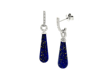 Bold yet graceful, these creative 9ct white gold diamond earrings are encrusted with eleven round brilliant cut white diamonds and a contrasting smooth tactile teardrop blue lapis lazuli stone to each earring.