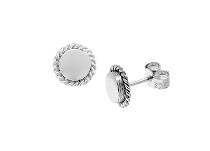 9ct White gold flat disc stud earrings with a highly polished top and a stylish rope twist design around the edge.