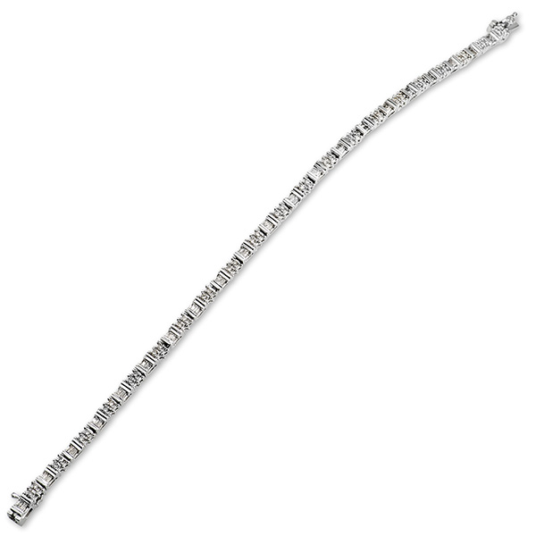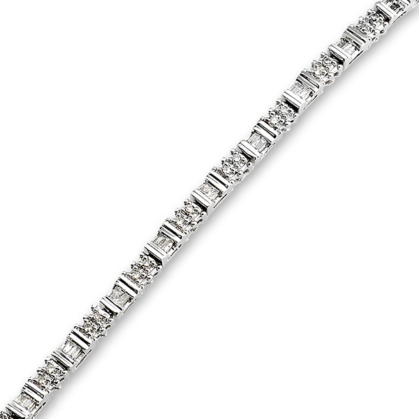 This beautiful 9ct white gold bracelet crafted in twenty-one sections, each containing two round brilliant cut claw set diamonds and two alternating tapered baguette diamonds, in a channel setting. This mixture of cuts captures and reflects light from all angles.