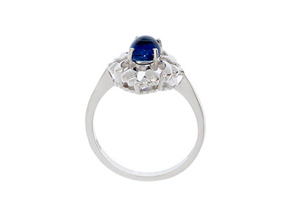 This gorgeous, elaborately styled dress ring has a tantalising glamorous look with sleek, creative curves and smooth contours. Crafted in 9ct white gold and set with a single smooth oval cabochon cut blue sapphire that will add a touch of colour to your outfit and look great for both day or evening wear.