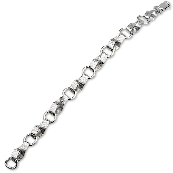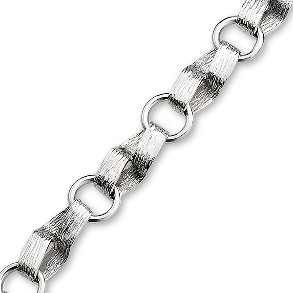 This beautiful robust 9ct white gold bracelet with eight solid ribbon style links, is hand finished with a tree bark pattern and brought together with contrasting plain solid links.