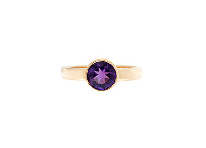 Featuring one 7mm round brilliant cut rich purple amethyst-associated qualities sincerity and peace.