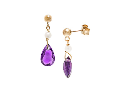 Starting at the top is a 4mm 9ct yellow gold ball stud fitting, following down to a round cultured pearl and then to a beautiful rich purple teardrop amethyst which is multi facetted on both sides.