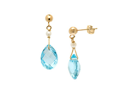 Starting at the top is a 4mm 9ct yellow gold ball stud fitting, following down to a round cultured pearl and then to a beautiful sky blue teardrop topaz which is multi facetted on both sides.