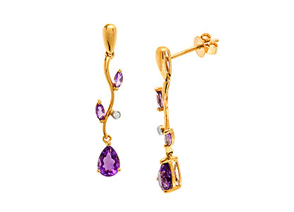 Make a bold statement with these gorgeous 9ct yellow gold drop earrings, drawing inspiration from shapes of nature. This unusual branch leaf and flower design, evokes a satisfyingly delicate and feminine feature with shimmering tranquil colours. Set with a single round white diamond, two marquise and one beautiful pear shaped purple amethyst in each earring.