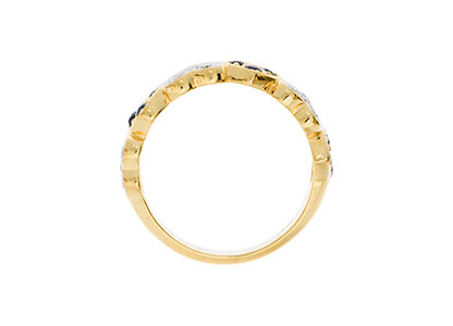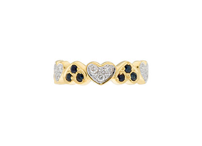 This unusual heart to heart eternity ring, consists of six heart shape sections, each set with alternating three diamonds and three blue sapphires. This stylish design creates a dramatic effect that is both romantic and eye-catching. An ideal gift for the one you love.