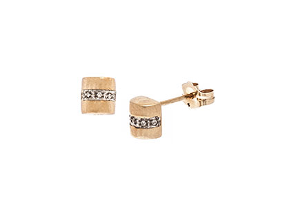 Elegant and sophisticated with a distinctive style. These beautiful 9ct yellow gold highly polished stud earrings, have a contrasting white diamond encrusted stripe wrapped around the centre. Inspired by the designs of the art deco period, a unique style that makes these earrings extra special.