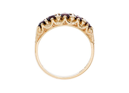 A gorgeous, 9ct yellow gold, traditional Victorian style carved ring, with scroll design to sides, set with five graduated round brilliant cut red garnets
