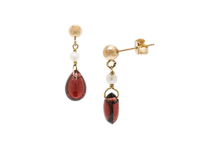 Starting at the top is a 4mm 9ct yellow gold ball stud fitting, following down to a round cultured pearl and then to a beautiful 9mm x 6mm blood red teardrop Mozambique garnet which has a smooth cabochon cut on both sides.