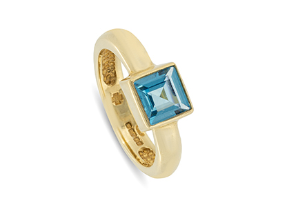 Featuring one 6mm square step cut blue topaz- associated qualities, wisdom and wealth.
