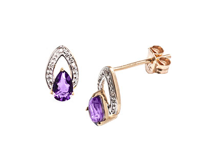 These beautiful 9ct yellow gold, diamond and amethyst stud earrings are elegant and intricately crafted. The pear shaped amethyst is crowned with a white gold marquise shaped top and set with a single illusion set diamond. Perfect for every day wear.