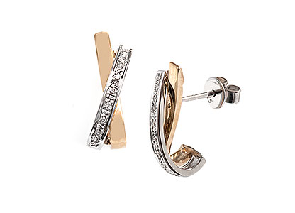 These gorgeous, sophisticated curved crossover stud earrings are designed to drop just below the ear to give a loop effect when worn. One plain yellow gold curved bar is overlaid with a contrasting white gold bar pave set with eight diamonds in each. Quality that speaks for itself, a truly exquisite pair of earrings.
