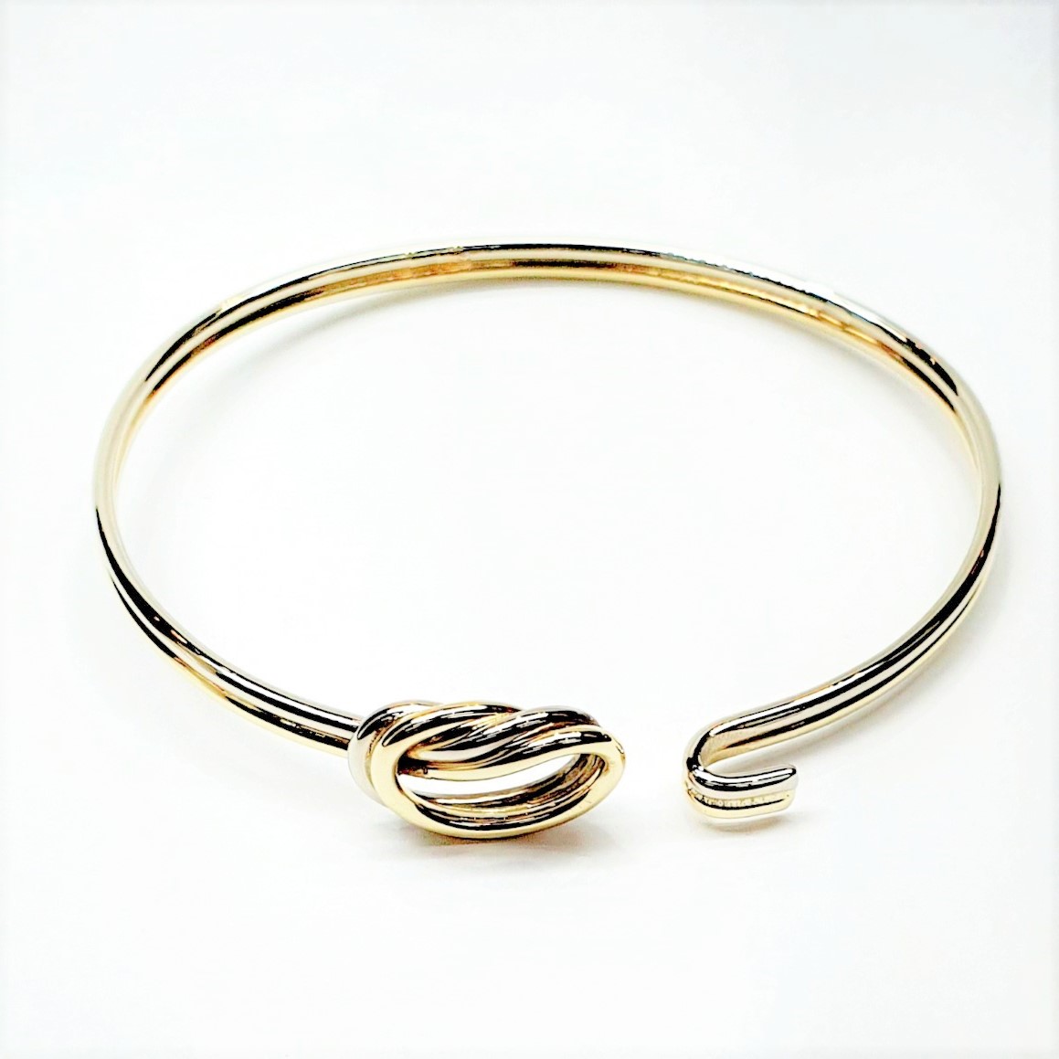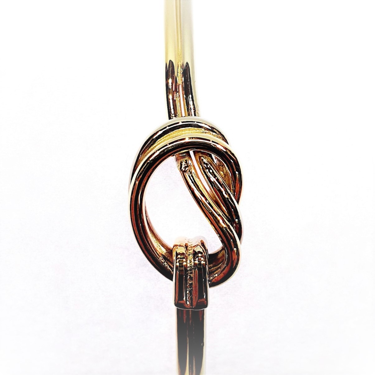 The yellow and white gold knot bangle also has a hook clasp for secure wearing, with the knot size approximately 18mm x 12mm.