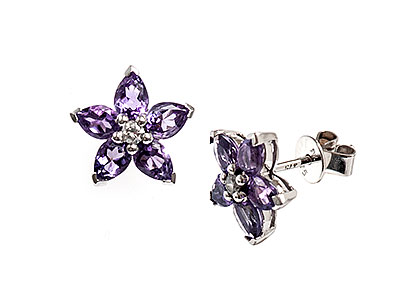 Simply stunning, these beautiful 9ct white gold diamond and amethyst stud earrings, are elegant and intricately crafted. The flower shaped white gold cluster settings, have a single round brilliant cut centre diamond, surrounded by five pear shape cool amethyst in a claw setting, which creates a dazzling display of sparkling passion.