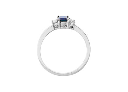 Elegant three-stone ring in 18ct white gold with a step-cut blue sapphire and baguette diamonds. Stocked in size M; other sizes available by special order within approximately ten working days.
