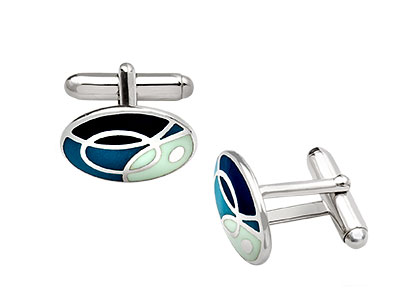 These stunning retro style oval cufflinks are slightly domed with a smooth tactile finish and are inlaid with white and two shades of turquoise blue cloisonné enamel.