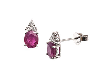 City of London Jewellers present these gorgeous 18ct white gold oval stud earrings, each Set with a single oval bright vibrant red ruby measuring 6mm x 5mm, with a three sparkling round white diamonds set into a triangular shape to the top of each earring.