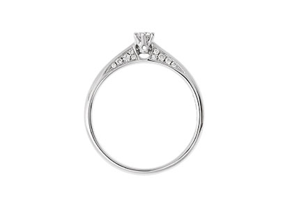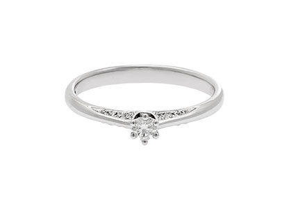 A graceful 18ct white gold ring with an intricate and innovative design. The four side edges of the shoulders are each set with five small round brilliant cut diamonds, enhancing the main centre diamond. A classic design with a refreshing added embellishment that she will love.