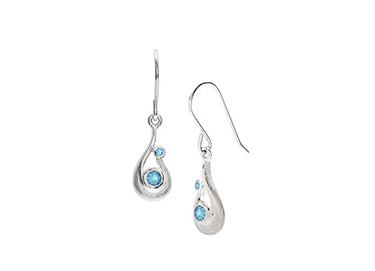 These elegant modern 925 real silver earrings have a frosted matt background, with a contrasting high polished wire coming from the loop and curving around a beautiful large round sky blue topaz which follows on to a smaller blue topaz, both secured in rub over settings.