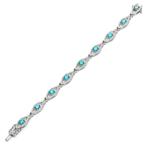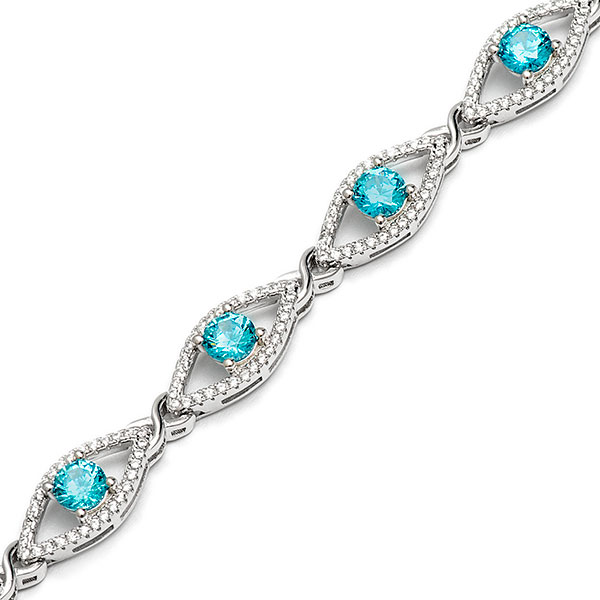 A gorgeous, modern style bracelet from the Bonita Jewels collection, that is sure to turn heads with admiring glances. Crafted from real silver into nine marquise shaped clusters, set with sparkling white and aquamarine blue cubic Zirconia’s. Each cluster is linked with a captivating highly polished feminine and romantic kiss link.