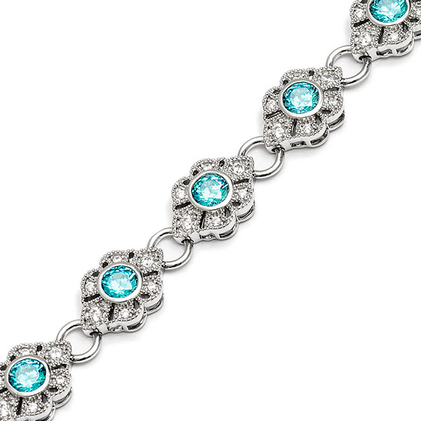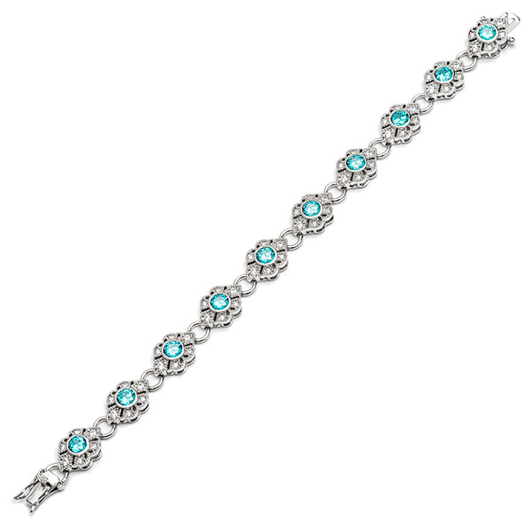 This gorgeous real silver bracelet is made up of ten separate clusters, each with a 5mm central sparkling aquamarine blue cubic Zirconia in a rub over setting, enhanced by a further six grain set sparkling white cubic Zirconia’s, creating ten exquisite stylish clusters each connected by a substantial solid plain polished ring, which give’s a comfortable free flowing movement.
