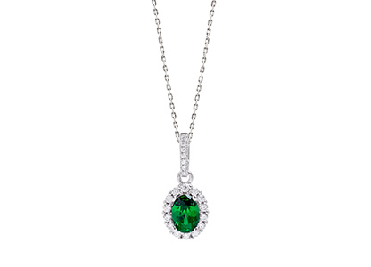 This classic oval shape pendant from the Bonita Jewels collection, is set with a single emerald green oval cubic zirconia to the front and a single row of round sparkling white brilliant cut cubic zirconia’s following onto the chain loop, creating a dramatic effect displaying exceptional sparkle that is both colourful and eye-catching.