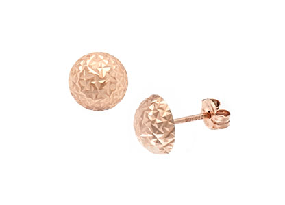 These vibrant, sparkling 9ct rose gold half ball or domed stud earrings, have a crazy diamond cut pattern, so called because the pattern is cut at every possible angle, making sure to catch and reflect light in every direction to create a dazzling display of sparkling fire as you move.